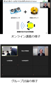 概要:ロボット設計・製作にあたり、ロボット関連の設備・装置などの説明を行い、先端ロボティクスについて学びました。また、新しい生活様式への対応を目指した人とロボットの協調技術の構築を目指し、受講者がグループに分かれて、ロボット開発の課題設定を行いました。最後に各グループよりロボット課題設定および仕様について発表を行いました。