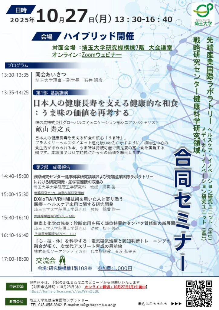 戦略研究センター健康科学研究領域と先端産業国際ラボラトリーでは下記日程で合同セミナーを開催いたします。