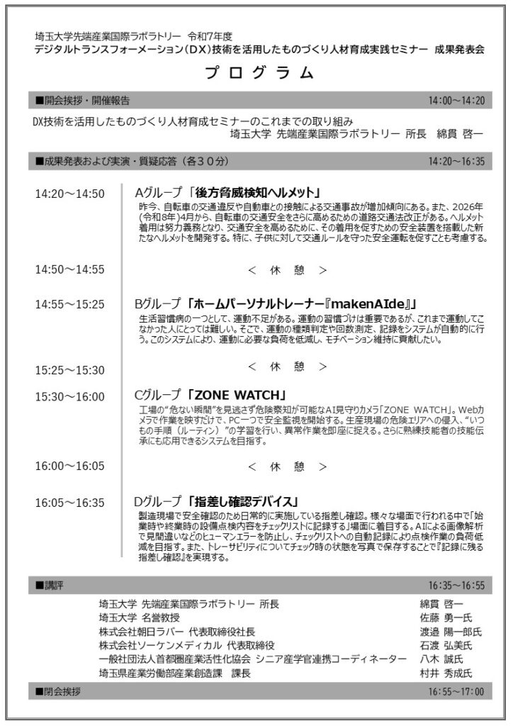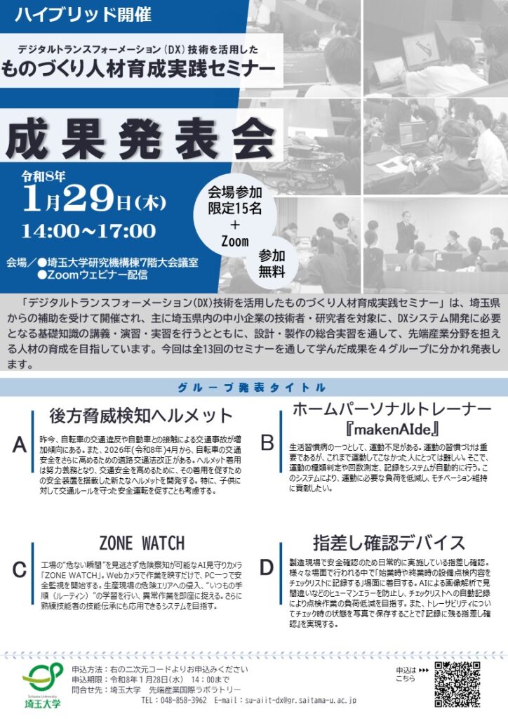 「デジタルトランスフォーメーション(DX)技術を活用したものづくり人材育成実践セミナー」は、埼玉県からの補助を受けて開催され、主に埼玉県内の中小企業の技術者・研究者を対象に、DXシステム開発に必要となる基礎知識の講義・演習・実習を行うとともに、設計・製作の総合実習を通して、先端産業分野を担える人材の育成を目指しています。今回は全13回のセミナーを通して学んだ成果を4グループに分かれ発表します。