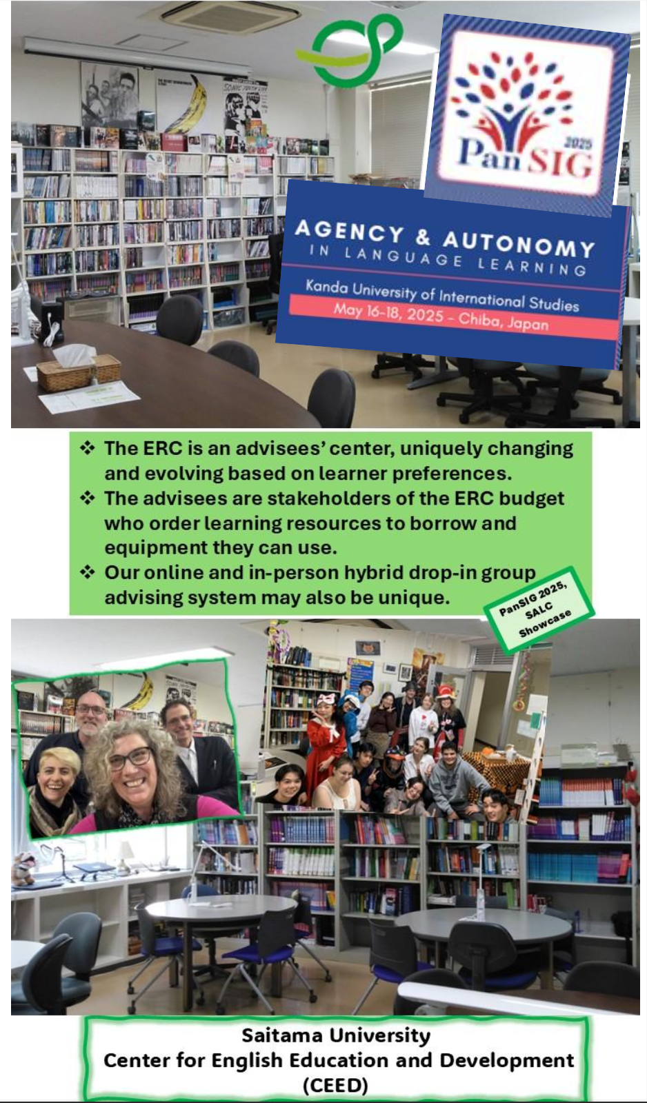 The ERC was accepted to present at the Founding Self Access Learning Center (SALC) Showcase at the PanSIG of the Japan Association for Language Learning (JALT) on May 17th and 18th, 2025, at the Kanda University of International Studies (KUIS), Japan! Our very own Stacey Vye and Adriana Edwards Wurzinger will represent the ERC. Descriptions are available at the link below.