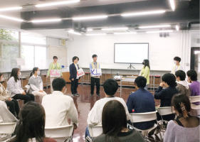 いま小中高の英語授業ではコミュニケーション能力の育成が大きな目標となっており、そのため、英語教師には正確かつ流暢に話せる「英語力」と児童・生徒の英語を伸ばす「授業力」が求められています。私の「中等英語科指導法」やゼミなどではグループに分かれて模擬授業や教材・教具の作成等を行い、学生同士が討論を通して教える力を高め、実践力を身につけられるよう工夫をしています。また、現代英語」ではディスカッション、スピーチ、ディベート、プレゼンテーションなど英語力、特に話す力を伸ばすさまざまな活動を用意しています。さらに、英語分野には参加者が日本語を使わず「英語だ」で丸一日過ごすプログラムもあり、参加者の英語力向上に役立っています。「確かな英語力」と「優れた授業力」――この2つが私の授業の大きな柱です。