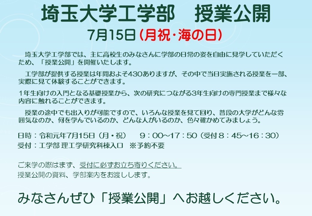埼玉大学工学部では、主に高校生のみなさんに学部の日常の姿を自由に見学していただくため、『授業公開』を開催いたします。