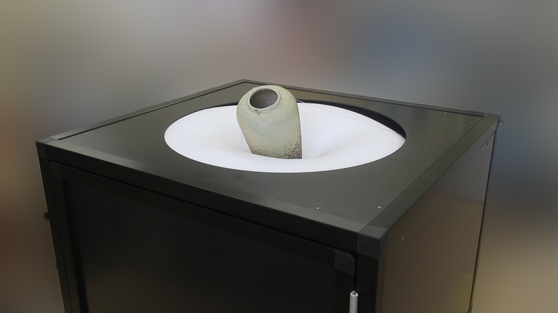 この装置は美術品の下に、砂のようにサラサラな「マイクロビーズ」を詰めたクッションを置いた構造。通常は平面になっているクッションが、緊急地震速報を受信すると、アリジゴクの巣のように中央部が落ち込み、美術品がそっと倒れます。