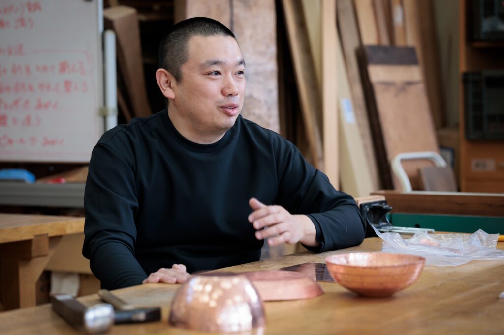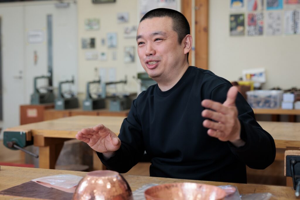 私は作家として作品制作をする一方で、美術教育のあり方を研究しています。作品の多くは、鉄や銅などの金属板を金槌で叩いて成形する「鍛金」という伝統技法を用いて制作していますので、直接的に小学校の図画工作や中学校の美術の授業とは関係が無いよう見えると思います。しかしながら、特殊で高度な伝統工芸だからこそ図工・美術の教員を目指す学生には経験してほしいと考えています。
