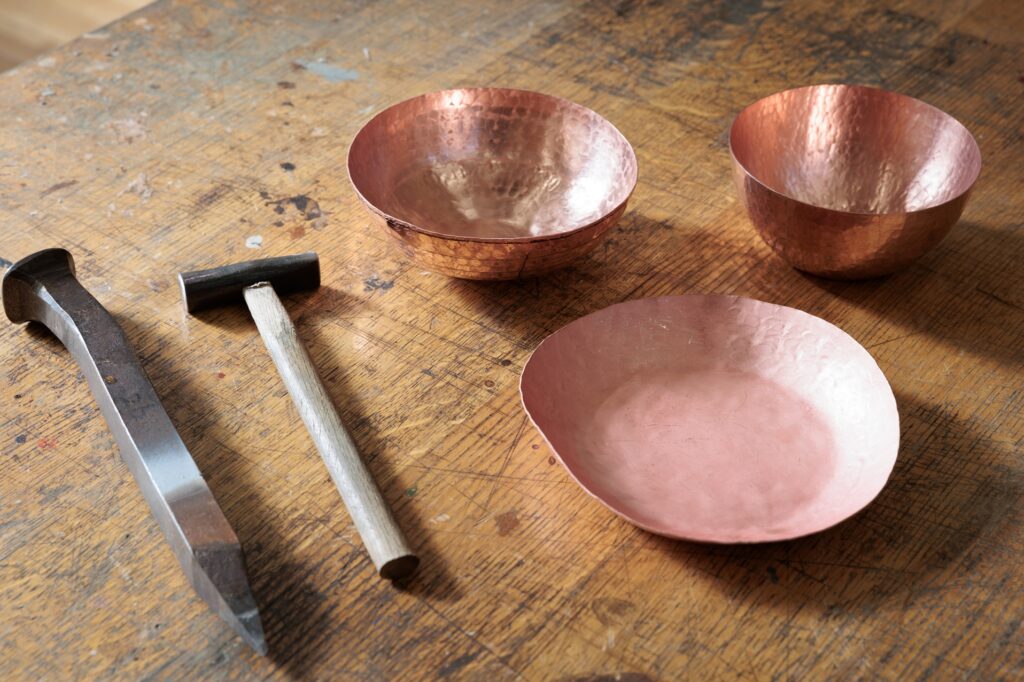 第二は、表現における技術について考えてほしいからです。図工や美術の授業では、表現を重視するあまり技術を後回しにすることがあります。しかし、場合によっては技術を持っている方が、より表現が自由になることもあると思います。特に、高度な工芸技術による「鍛金」の制作活動では、素材を変形させるにも、表面に模様をつけるにも、金槌で叩くことだけが唯一の方法ですので、様々な叩く技術を使い分ける能力が必要となります。この技術を使い分ける能力「技能」が養われる経験が大切なのです。