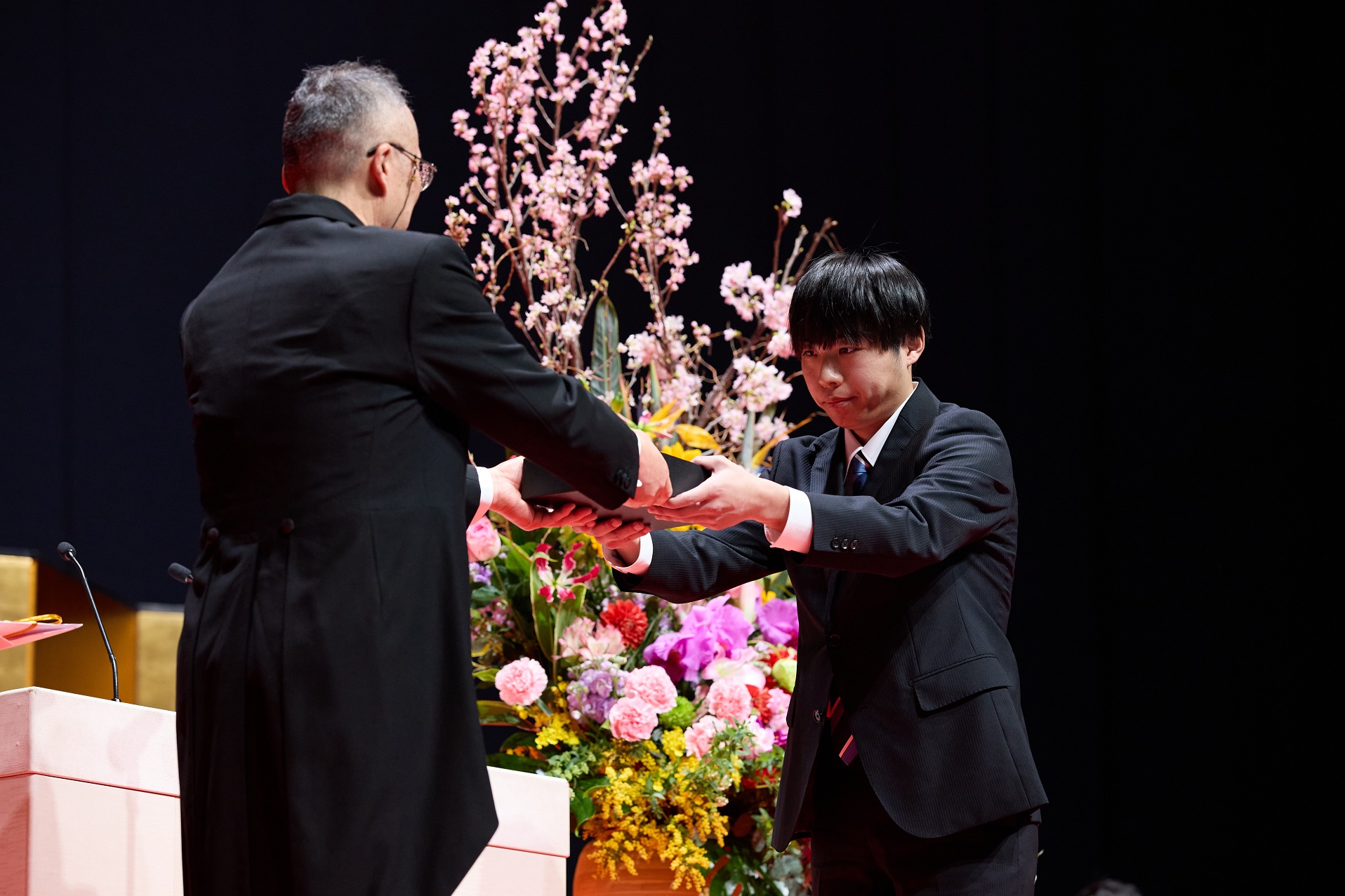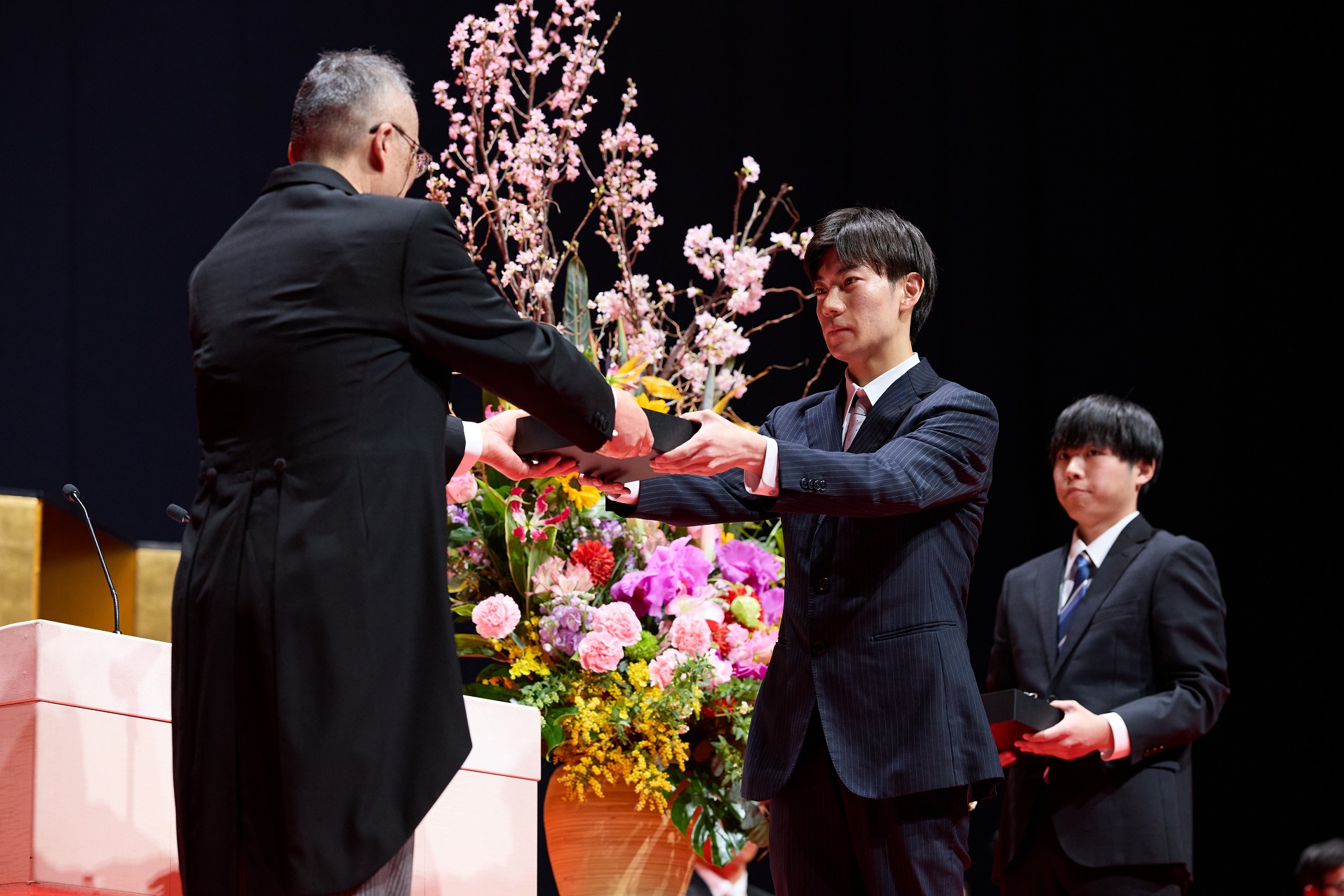毎年、卒業生の中から研究者への高い志を有する学生を表彰する「梶田隆章賞」。若手研究者の育成推進を目的に、本学フェローで、2015年にノーベル物理学賞を受賞された梶田隆章先生(東京大学宇宙線研究所・卓越教授)の寄附により創設された表彰制度です。令和6年度は、工学部と理学部から1名ずつ計2名の学生が表彰されました。