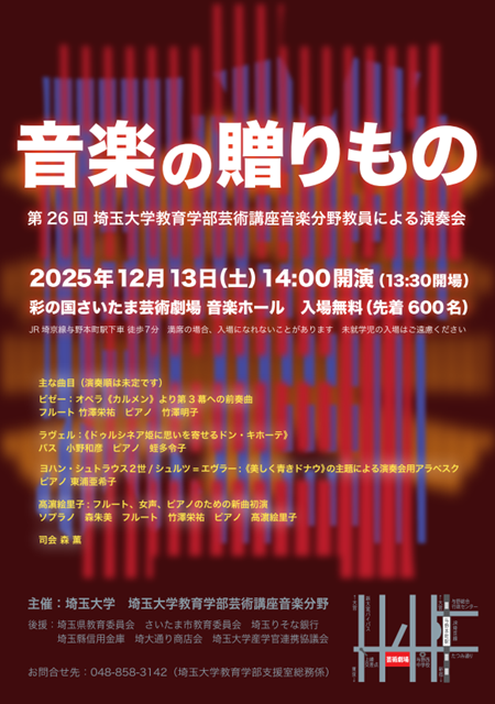 | 出演者 | 埼玉大学音楽分野教員: 小野和彦(声楽)、髙濵絵里子(作曲)、竹澤栄祐(フルート) 、東浦亜希子(ピアノ)、森薫(音楽科教育) 客演: 蛭多令子(埼玉大学名誉教授、ピアノ)、竹澤明子(ピアノ)、森朱美(ソプラノ) |