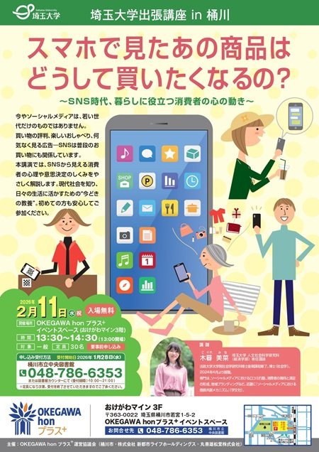 埼玉大学と桶川市が連携し、公開講座「スマホで見たあの商品はどうして買いたくなるの?~SNS時代、暮らしに役立つ消費者の心の動き~」を開催します。