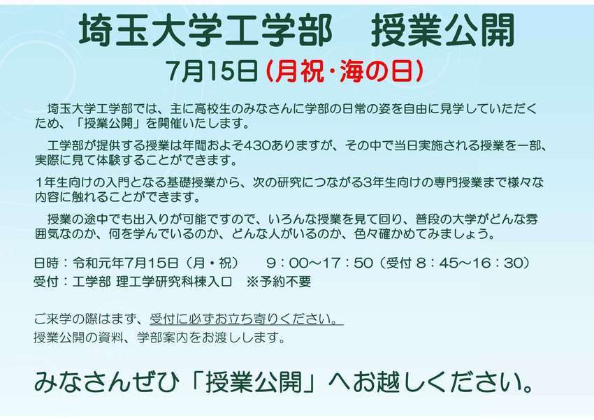 埼玉大学工学部2019『授業公開DAY』のご案内