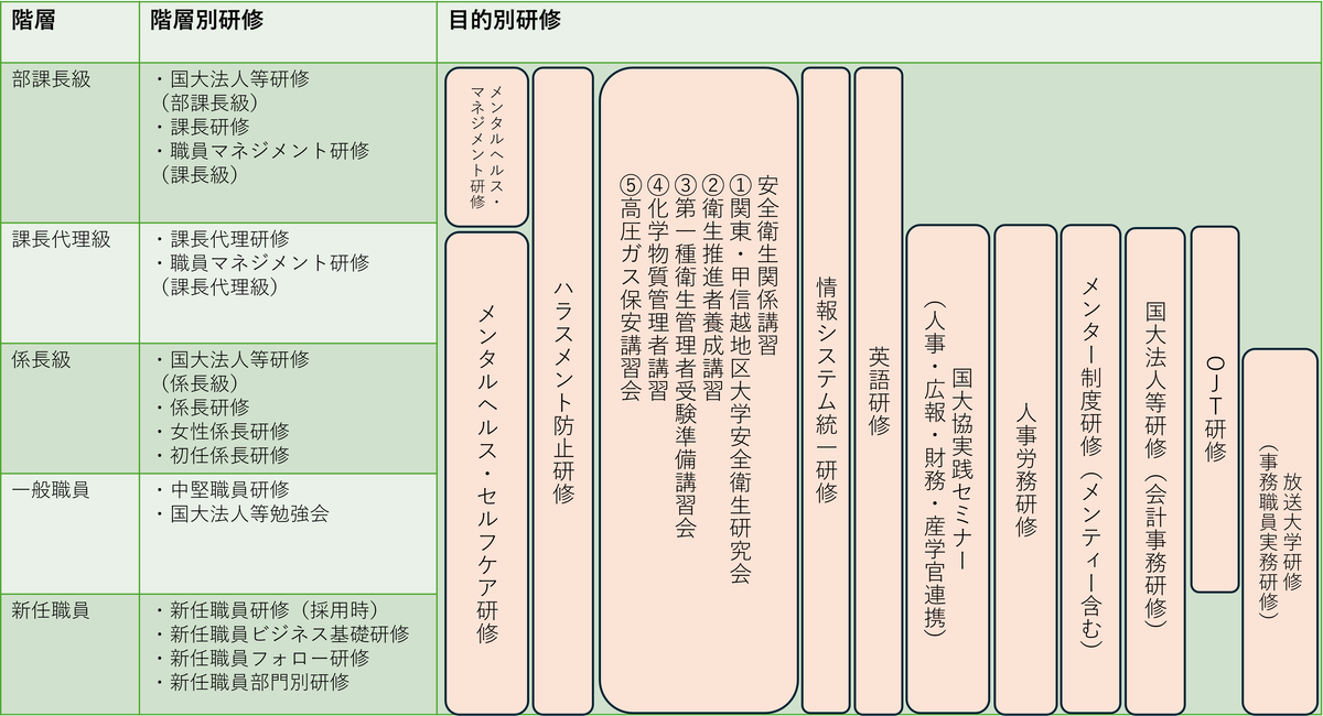 本学では、階層別研修として、学内で行う新任職員研修や、新任職員フォロー研修、中堅職員研修などがあります。