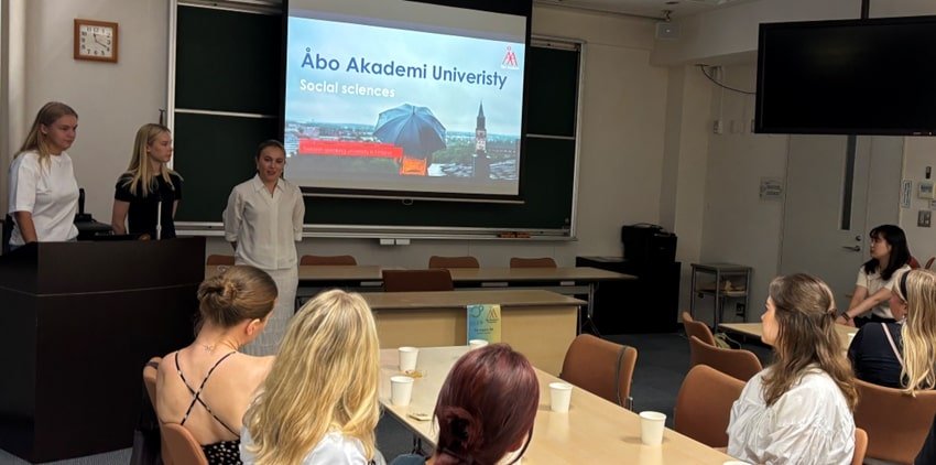 第1部では、両大学への留学を興味のある学生に向けた紹介が行われました。本学については、留学経験を持つ国際室インターン生(教養学部および教育学部の日本人学生)が担当し、アーボ・アカデミー大学については政治社会科学専修クラブの執行部の学生が担当しました。大学の概要や学生生活、課外活動の様子などが紹介され、共通点や相違点について理解を深める良い機会となりました。その後、本学学生がアーボ・アカデミー大学の学生を案内するキャンパス・ツアーも実施されました。