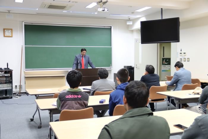 懇談終了後、川本教授の進行により、本学学生を対象にした特別講演が行われました。講演では、パキスタンの現状と課題、日本とパキスタンの関係や開発援助、人材育成の重要性など多岐にわたる話題提供があり、参加した学生にとって国際的な視野を広げる貴重な機会となりました。