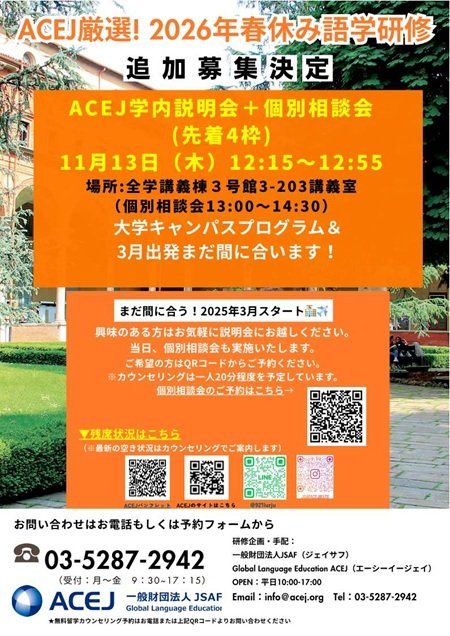 埼玉大学がパートナーシップを締結しているJSAF(日本スタディ・アブロード・ファンデーション)の姉妹団体であるACEJが、春休みに実施する短期語学研修プログラムで追加募集を行っています。