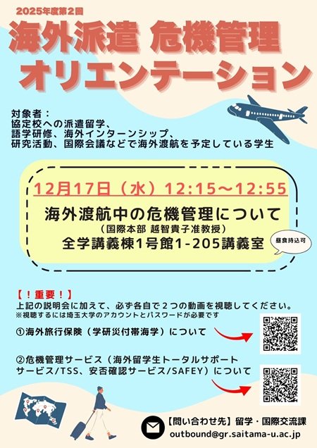 2025年度第2回海外派遣危機管理オリエンテーションを開催します。今年度の冬~春にかけて、大学が認めるプログラム(協定校への派遣留学、語学研修、海外インターンシップ、研究活動、国際会議など)で海外渡航を予定している学生が対象です。