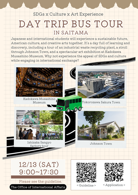This day trip explores unique destinations in Saitama while learning about SDGs, cultural diversity, and art. At Ishizaka Industries, participants discover how environmental protection and industry coexist. In Johnson Town, they experience a multicultural community built on distinctive historical architecture. The tour concludes at Kadokawa Musashino Museum, where Japanese pop culture and art blend in a dynamic and creative space. Please see the guideline here.