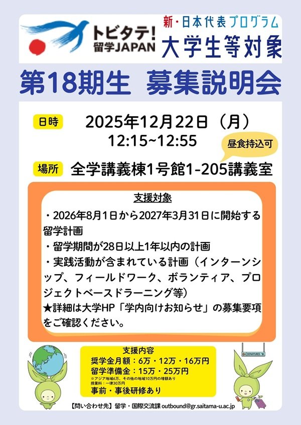 官民協働海外留学支援制度「トビタテ!留学JAPAN 新・日本代表プログラム」の2026年度(第18期)派遣留学生の募集を開始します。本募集では2026年8月1日~2027年3月31日までの間に留学を開始する学生を対象としています。添付の学内募集要項、およびトビタテ公式HPの募集要項を確認の上、期日までにエントリーシートを留学・国際交流課に提出してください。
