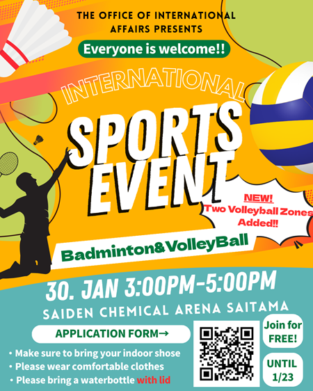 We are hosting an “International Sports Event” for active international exchanges between Japanese students and international students through sports. We will hold badminton and volleyball events same as last time. Please check the poster for details. Applications are accepted via the QR code on the poster.