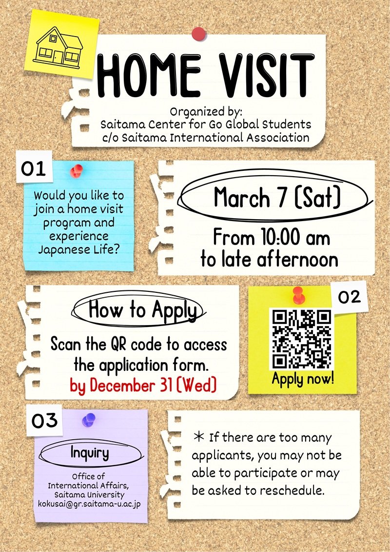 Would you like to join a Home Visit and experience Japanese life? This program is organized by Saitama Center for Go Global Students (GGS). GGS will find you a host family.