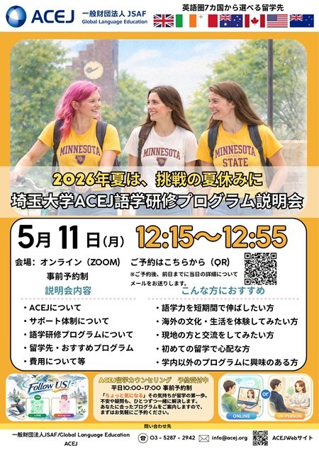 【5月11日(月)】JSAFプログラム(ACEJ 2026年夏休み語学研修)オンライン説明会のお知らせ