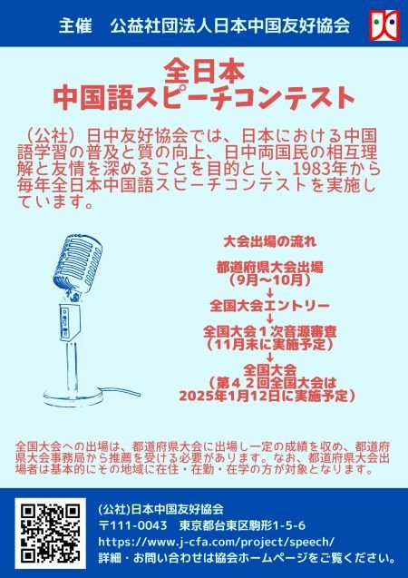 私ども公益社団法人日本中国友好協会では、毎年「全日本中国語スピーチコンテスト全国大会」を開催しております。今年で42回目を迎えるこの大会には、文部科学省や外務省、中国大使館教育処など、多くの方々からご後援やご協力をいただいております。