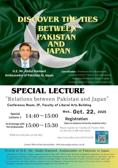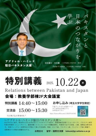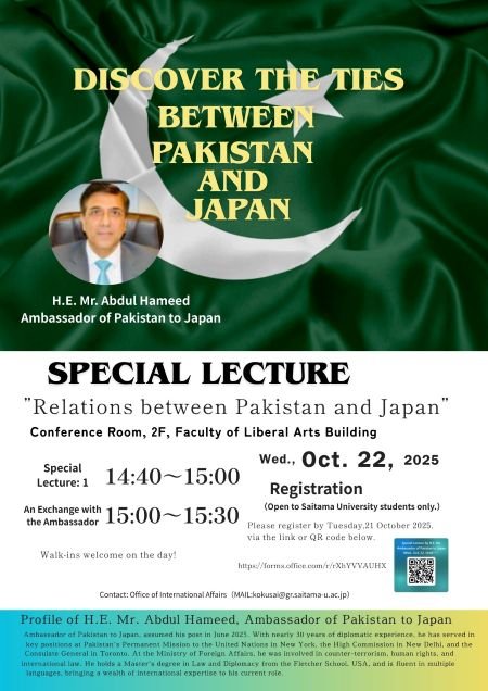 The special lecture will be given by the Ambassador of Pakistan to Japan.