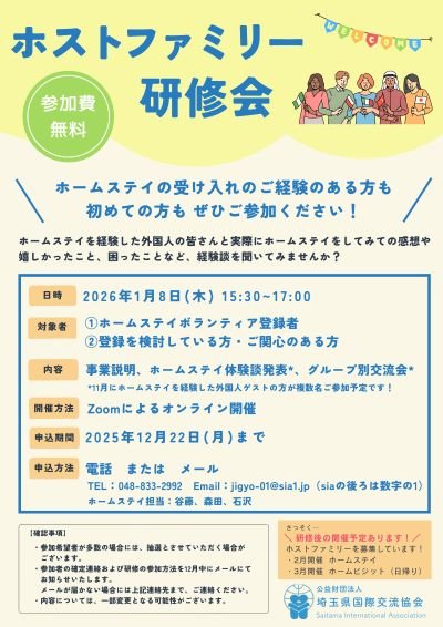 この度、埼玉県国際交流協会の主催で、ホームステイを経験したことのある外国人ゲストをお招きし、ホームステイの経験談を直接お聞きいただける研修会を開催いたします。