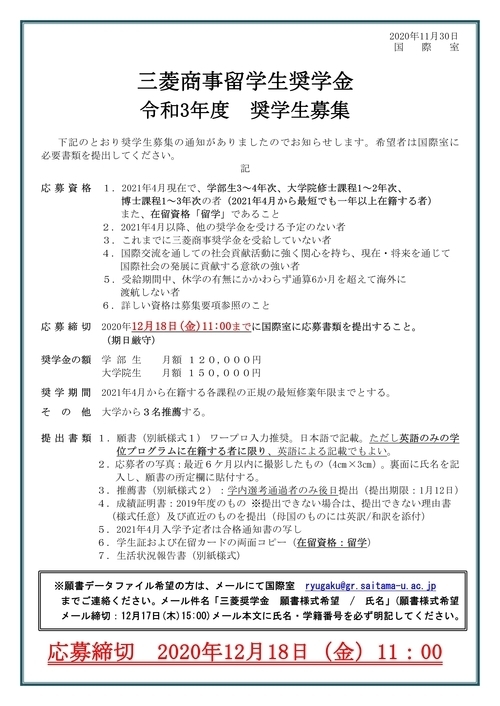 私費留学生対象 令和3年度 三菱商事留学生奨学金 受給者募集