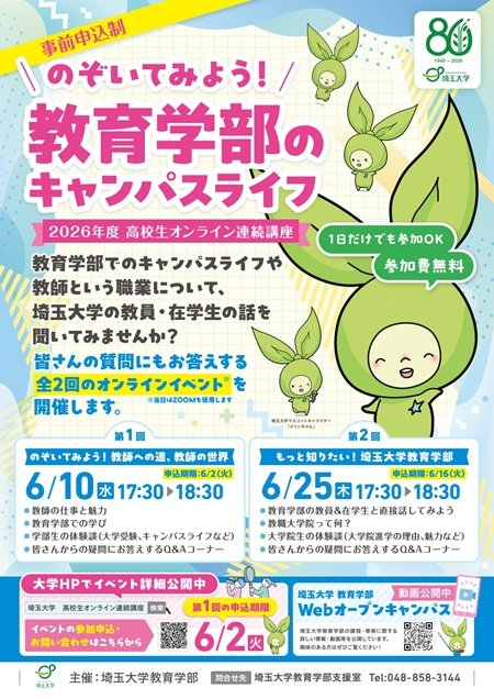 夏に行われるオープンキャンパスに先駆けて、埼玉大学教育学部を知る機会にもなりますので、少しでも興味がある方はぜひご参加ください。