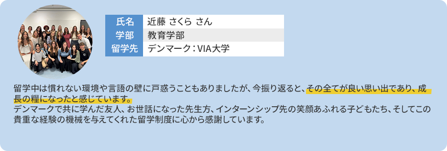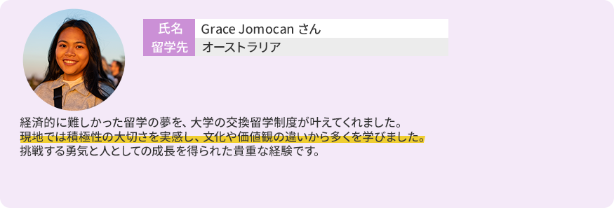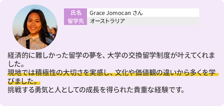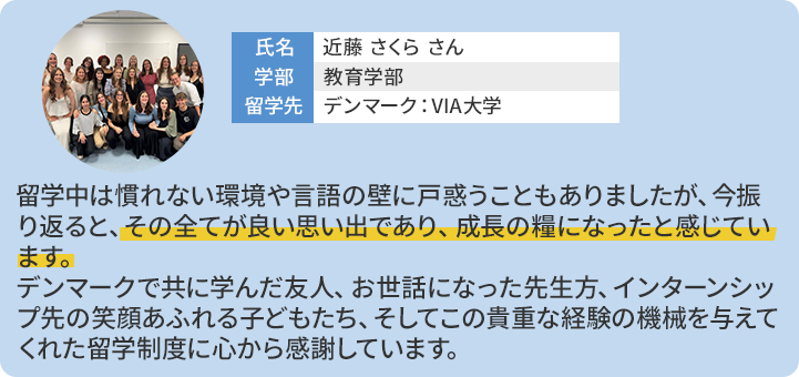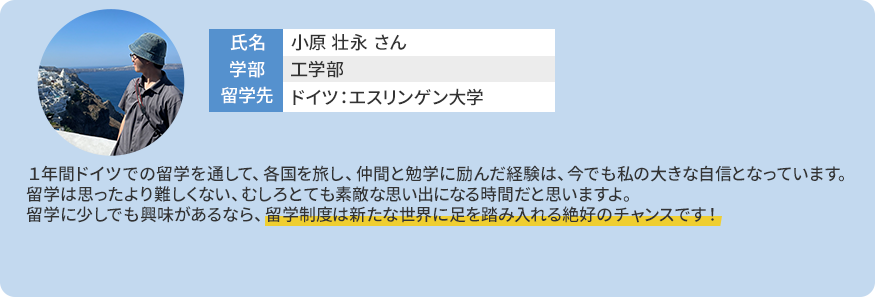 - ・留学期間中の授業料は埼玉大学に納入し、留学先の入学料・授業料は免除されます。