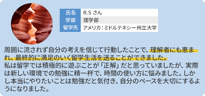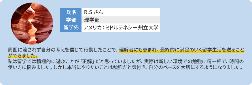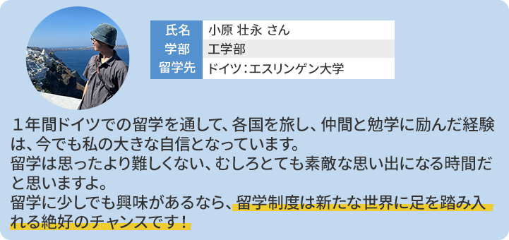 A留学・国際交流課にご相談ください。教員による留学相談も受け付けています。