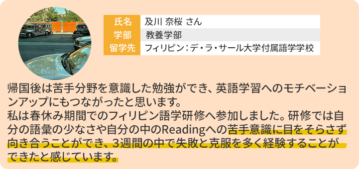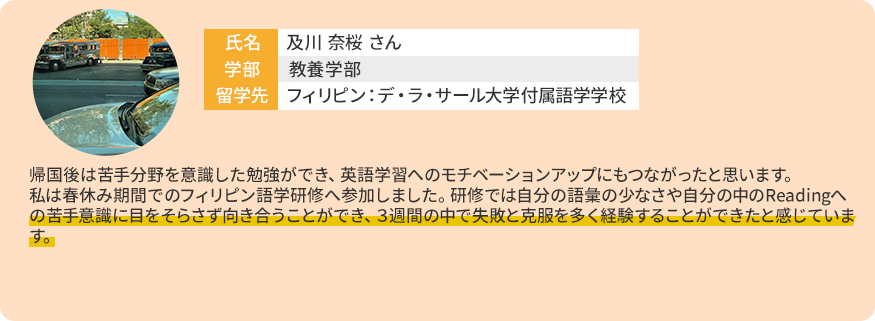 - ・デ・ラ・サール大学(フィリピン):約3週間(9月/3月)