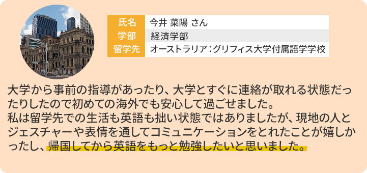 - ・英語スコア等の参加要件はありません。海外協定校が提供する授業に参加し、短期間で集中して語学力を向上させることができます。