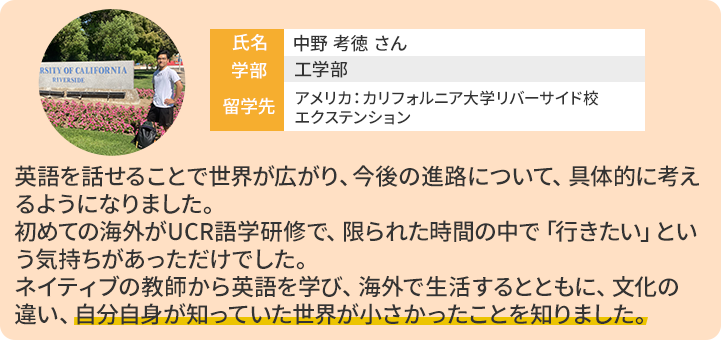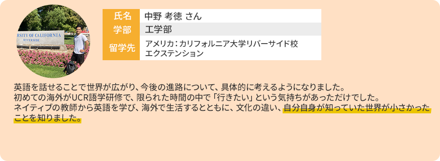 - ・カリフォルニア大学リバーサイド校(アメリカ):約4週間(8~9月)