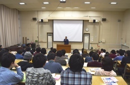 一斉避難訓練終了後、防災意識の高揚及び防災知識の普及・啓発のため、さいたま市桜消防署員の方々のご協力の下、消防訓練を実施しました。教育学部C1講義室では、「これだけは守りたい外出先の地震対策」と題した防災ビデオを視聴し、消防署員の方より、外出先での「避難経路の確認」、「落下物の危険予測」など、日頃から万が一に備え意識することの大切さについての説明がありました。続いて消防署への火災発生通報訓練、三角巾を使用した応急処置訓練、AED講習などが行われ、代表者が指導を受けながら実習を行いました。