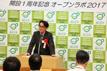 第2部の開設1周年記念式典では、山口宏樹学長が挨拶を述べるとともに、「産学官金の連携を進め、スペースの提供により共創を具現化し、インキュベーションを行っていきたい」と先端ラボにかける思いが語られました。その後、来賓の小山竜司文部科学省高等教育局国立大学法人支援課長、三浦裕幸経済産業省関東経済産業局地域経済部長、渡辺充埼玉県産業労働部長(代理:高橋利男先端産業課長)から祝辞が述べられました。
