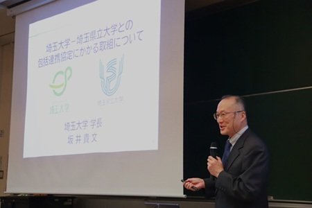 発表会は、まず本学の坂井貴文学長 による「埼玉大学-埼玉県立大学との包括連携協定にかかる取組について」と題した講演から始まりました。坂井学長は、両大学が2022年に包括連携協定を締結して以来、教育・研究・産学連携の各分野で協働を深化させてきた経緯を紹介しました。さらに、学部・大学院での単位互換制度の実現や共同研究支援プログラムの継続的な推進により、理工・医療福祉・教育など多様な分野で成果が生まれていることを報告しました。加えて、共創の場形成支援プログラムへの共同申請やInland Japan Innovation Ecosystem (IJIE) への共同参画など、地域イノベーション創出に向けた挑戦を振り返りました。最後に坂井学長は、両大学の相互補完的な強みを生かし、地域課題の解決と持続可能な社会の実現に貢献していく決意を表明しました。