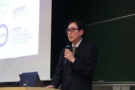 「太陽系における生命起源物質の進化検証と関連教材の開発」と題し、隕石や小惑星試料を用いた分析を通じて生命起源物質の進化を検証し、地球内部環境を再現した加熱実験の成果、ならびに太陽系形成を学ぶハンズオン教材を開発し科学教育への展開について報告