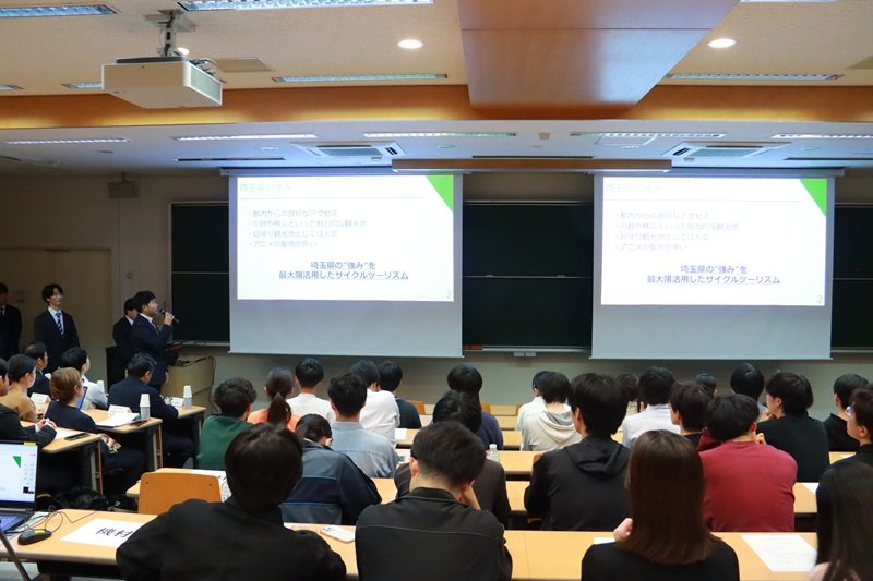 工学部 小嶋文准教授ゼミでは、埼玉県の観光における課題を踏まえたサイクルツーリズム施策として①自転車観光支援②観光体験③魅力度向上を列挙し、これらのサービスや案内を提供する「彩くるアプリ」の開発を提案しました。アニメ聖地を活用したコラボレーションなど、埼玉県の強みを活かす企画を通じて、持続可能な観光発展を目指しています。