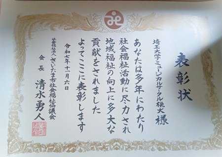ミュージカルサークル「桃犬」がさいたま市社会福祉協議会会長表彰を受賞