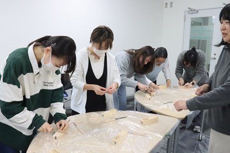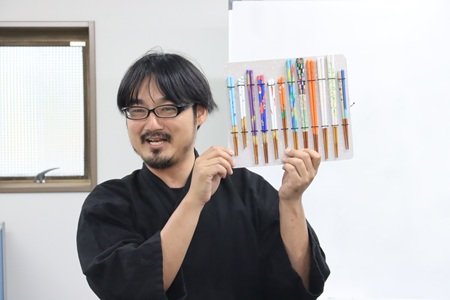 のこぎりを初めて使う留学生も多く、最初は戸惑いながらも、三田村氏のご指導のもと、きれいに切ることができました。次に、2種類の紙やすりを使って切り口を整え、その後、カラーペンで好きな色や柄を描き、それぞれが思い思いのデザインで「マイ箸」を作成しました。