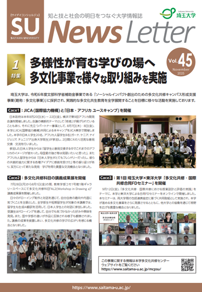 広報誌「SU News Letter」Vol.45を発行しました 2025/11/17埼玉大学広報誌「SU News Letter」Vol.45を発行しました。「SU News Letter」は、本学の主な出来事などを広く社会に紹介する広報誌です。今号では「多様性が育む学びの場へ 多文化事業で様々な取り組みを実施」を巻頭特集に、2025年7月~9月の間の埼玉大学のニュースをお届けします。皆様是非ご覧ください!