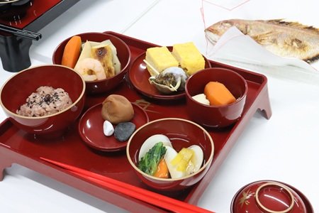 講義の冒頭では、お食い初めのデモンストレーションが行われました。用意された器のセットには、長谷川氏自らが調理した料理が盛り付けられ、父母役、祖父母役を決めて、実際のお食い初めの流れを体験しました。食材一つひとつに長寿や縁起の良さなどの意味が込められていることが紹介され、和食文化への理解を深める貴重な学びの機会となりました。