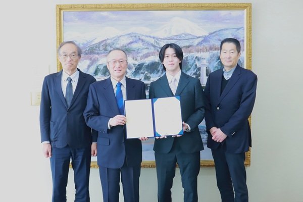 授与式では、坂井貴文学長から株式会社nekonata代表取締役の田原大輔氏(大学院理工学研究科 博士前期課程)に対し、称号記が手渡されました。