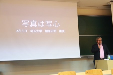 世界各国で写真展を開催し、写真家の第一人者として知られる相原正明氏に、本学にて2月3日、特別講演という形でご講演いただきました。講演タイトルは「写真と写心」です。学内ばかりでなく、学外にも本講演会の開催を告知したことで、一般の参加者及び関連企業の方々にもご参加いただき、本学の教員、学生を含め、合わせて25名の参加者がありました。会場となったシアター教室は、まるで写真の展示会場のような雰囲気に包まれ、前方スクリーンには相原氏による多くの写真作品が映し出されました。