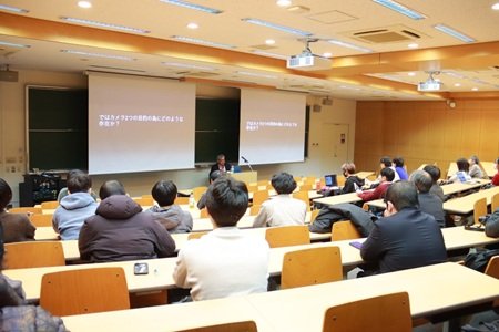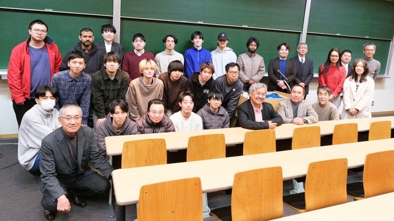 2時間の講演後に質問を受け付ける時間が取られ、学生から果敢に質問が寄せられました。最後に記念の写真を参加者全員で、普段利用されているプロ用のカメラを利用して、学生がカメラマンとなり撮りました。参加者にとって、大変貴重な忘れがたい時間になりました。ご講演いただきました相原氏に、心より御礼申し上げます。