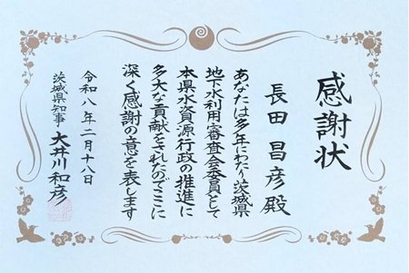 理工学研究科・社会変革研究センターレジリエント社会研究部門の長田昌彦教授が、茨城県地下水利用審査会委員として茨城県の水資源行政の推進に多大な貢献を行ったことが評価され、2月18日、大井川和彦茨城県知事より感謝状を授与されました。
