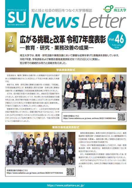 広報誌「SU News Letter」Vol.46を発行しました 2026/2/24埼玉大学広報誌「SU News Letter」Vol.46を発行しました。「SU News Letter」は、本学の主な出来事などを広く社会に紹介する広報誌です。今号では「多様性が育む学びの場へ 多文化事業で様々な取り組みを実施」を巻頭特集に、2025年10月~12月の間の埼玉大学のニュースをお届けします。皆様是非ご覧ください!クリックするとPDFで表示されます