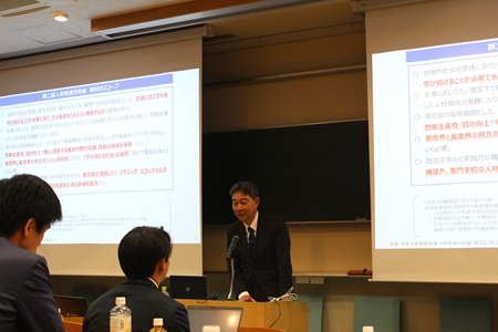 第一部の来賓講演では、文部科学省 総合教育政策局 生涯学習推進課 課長補佐の高野智志氏より、「文部科学省が考えるリカレント教育の重要性と未来に向けた取り組み」と題し、国のリカレント教育の方針、企業・大学におけるリカレント教育の導入状況、今後の課題をご紹介いただきました。