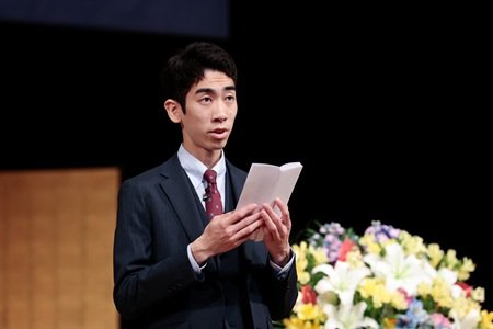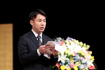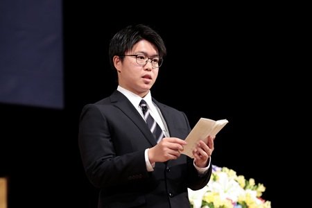 また、本卒業式では「梶田隆章賞(本学理学部を卒業し、2015年にノーベル物理学賞を受賞した梶田隆章さんの栄誉を称え、次世代の若手研究者の育成を目的に設立)」の授与も行われ、本賞を受賞した理学部数学科 池竹 和豊さん、工学部応用化学科 尾﨑 未琉さんの2名にクリスタル盾と副賞が授与されました。