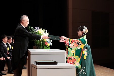 坂井貴文学長は式辞で「誠実に積み重ねられた努力は、皆さん自身の力を育むと同時にやがて『あの人に任せてみよう』という思いを生み、確かな信頼として蓄えられていきます。その信頼は、人生の節目において皆さんを支え、新たな扉を開く力にもなっていくはずです」と卒業生・修了生にエールを送りました。